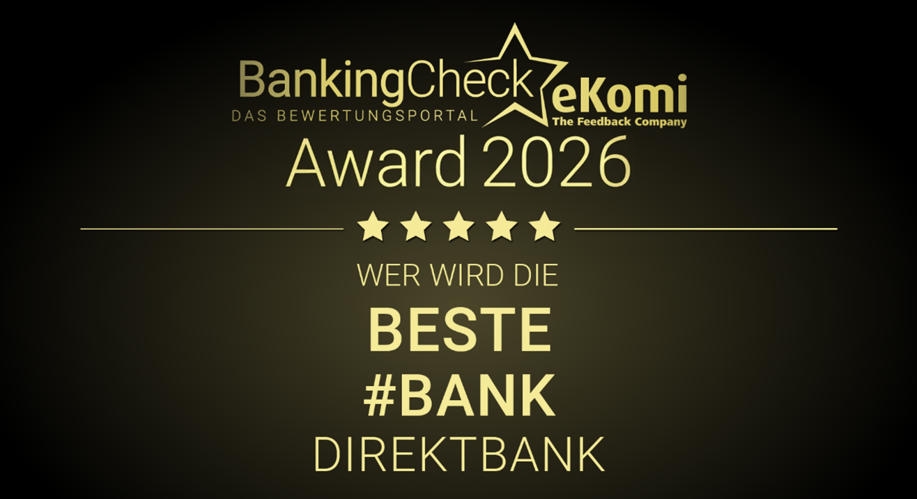Der BankingCheck Award ist eine kundenbasierte Auszeichnung von Anbietern und Produkten aus der Finanz- und Versicherungsbranche. Bewerten Sie unser Tages- und Festgeld sowie unsere U18-Geldanlagen.